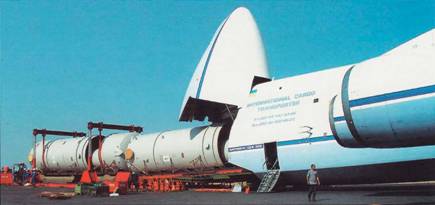 Как видим, Ан-124 стал необходимым элементом технологической цепочки «производитель-перевозчик- потребитель». В своей сфере – моногрузы с размерами, которые не может вместить ни один другой самолет в мире и массой до 120 т и более – он не имеет конкурентов. Применение самолета для перевозки именно таких грузов и принесло ему наибольшую славу. А первые по-настоящему уникальные коммерческие перевозки организовал Фойл. Так, в ноябре 1989 г. «Руслан» под командованием Ю.В.Курлина доставил из Хельсинки в Мельбурн волок печатной машины массой 53 т. В январе 1991 г. из Барселоны в Новую Каледонию перебросили три трансформатора по 42 т каждый. Затем последовало множество подобных операций, в т.ч. занесенная в Книгу рекордов Гиннесса перевозка электрогенератора фирмы Siemens массой 135,2 т из Дюссельдорфа (Германия) в Дели (Индия). В 1998 г. 132-тонная паровая турбина той же фирмы была доставлена в Чили. В апреле того же года на Маршаловы острова отвезли опреснительную установку массой 72 т. Самолеты «Авиалиний Антонова» доставляли в различные точки планеты оборудование для химической промышленности, части европейской ракеты-носителя «Ариан-5», вертолеты, суда, электровозы и т.д.