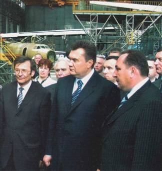 28 мая 2004 г. Премьер-министр Украины В.Ф.Янукович провел совещание о современном состоянии и перспективах отечественной авиапромышленности, в ходе которого посетил завод «Авиант». На снимке, слева направо: министр промышленной политики А.Л.Неустроев, Премьер-министр Украины В.Ф.Янукович и Генеральный директор КиГАЗ «Авиант» О.С.Шевченко в одном из цехов предприятия