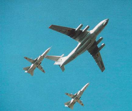 Транспортный Ил-76МД и бомбардировщики Су-24 в парадном строю
