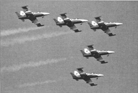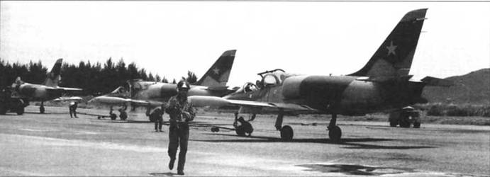 Буквально через 10 минут после приземления Духоню пришлось вновь поднимать новинку в воздух. Дело в том. что на предприятие прибыли представители верховной власти страны, для которых устроили небольшое авиашоу с показом одиночного и группового пилотажа -Дельфинов-. -Альбатрос- в сопровождении одноместного L-29A сначала прошел на небольшой высоте и малой скорости с выпущенными тормозными щитками и с зажженными посадочными фарами. Затем последовал ряд скоростных проходов, завершившихся эффектным набором высоты с выполнением боевого разворота. Все это произвело самое благоприятное впечатление на высоких гостей.