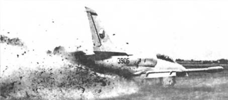 Испытания самолета L-39 Х-06 на раскисшем аэродроме. Весна 1974 г. Самолет L-39 Х-07 во время Госиспытаний в СССР Двухщелевой закрылок. На фюзеляже видны окна воздушного канала воздухо-воздушного радиатора СКВ