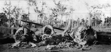 Американский А-24 «Бенши» (вверху) и австралийский L-14 «Хадсон», уничтоженные японской авиацией в Дарвине 19 февраля 1942 г.