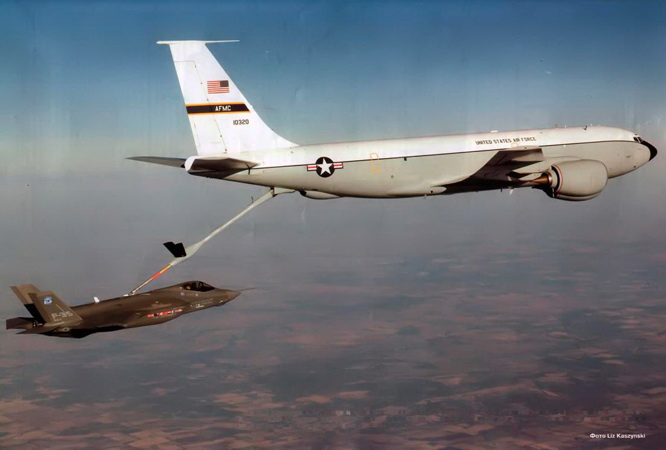 13 марта американская корпорация Lockheed Martin объявила о начале испытаний истребителя F-35 Lightning II по дозаправке в воздухе. На фото, сделанном днем раньше, запечатлена первая стыковка «Лайтнинга» (это название, вероятно, никогда не останется невостребованным) с воздушным танкером Boeing КС-135.