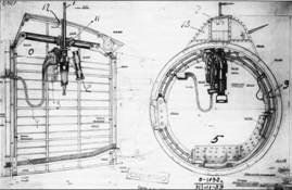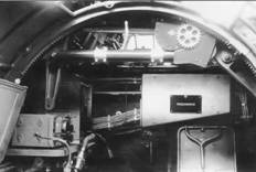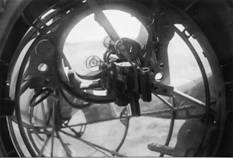Вид на кабину стрелка-радиста через входной люк, «аэродинамический двигатель» средней оборонительной установки и левая опора шасси
