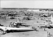 В нынешнем году этот представительный авиафорум отпраздновал свое 60-летие. Первая британская авиавыставка состоялась в 1918 г. в лондонском комплексе «Олимпия». В 1932 г. она переместилась на аэродром в Хендоне (пригород Лондона), затем проводилась на аэродромах Хетфилда и Радлетт в графстве Хартфордшир и, наконец, в 1948 г. переехала в Фарнборо, где располагалось Научно-исследовательское отделение Королевских Воздушных Сил. Если 60 лет назад количество участников составляло 187, то на нынешнем – были представлены около 1500 компаний и фирм из 40 стран мира. На фото: панорама первого авиасалона в Фарнборо. 1948 г.