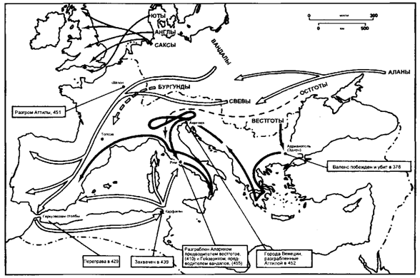 Описания различных германских народов можно найти у Е. А. Томпсона (Римляне и варвары: упадок Западной империи, 1982) и Дж. Д. Рандерса-Персона (На заре борьбы в Европе, 400—700 гг. н. э., 1983). В Восточной Европе были два больших германских государства — остготы («светлые готы») на Украине и вестготы («мудрые готы») — на территории нынешней Румынии. Грозная кавалерия гуннов, негерманского народа, ворвалась в эти районы около 370 г., разрушила королевство остготов и погнала перед собой 200 000 вестготов вдоль Дуная в Восточную Римскую империю, где представители Валенса разрешили им селиться. Но вскоре поселенцы-вестготы воспротестовали, имея для этого основания, против угнетения и эксплуатации со стороны восточных римлян, а затем восстали против них. Под предводительством своего вождя Фритигерна они опустошили Балканы; в то же время другие германские племена, расселившиеся вдоль Дуная, пробудились от спячки. Император Валенс поспешил из Азии и намеревался атаковать их у Адрианополя 9 августа 378 г. Вестготы опередили его и после успешной фланговой атаки своих всадников одержали ошеломительную победу. Римская кавалерия бежала, пехота была полностью уничтожена. Валенс погиб, и никто не нашел его тело.