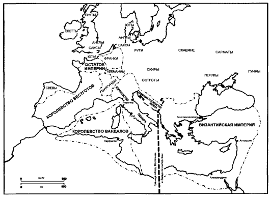 Падение Западной Римской империи было одним из самых серьезных превращений (любимое слово для обозначения всего процесса, особенно в Германии) за всю историю человечества. За сто лет до этого Рим был мощным государством с огромной армией. Спустя сто лет и власть, и армия исчезли. Западная империя вообще перестала существовать. Ее территория была занята несколькими королевствами германских племен.