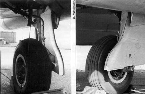 Шасси трехопорное с одноколесными основными опорами и двухколесной передней. Все стойки шасси оснащены масляно-воздушными амортизаторами (давление зарядки ~ 28 кг/см