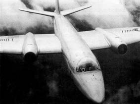 Новая спецификация датирована 1947 г., а четыре первых прототипа построили в 1948-49 гг. по старой спецификации, т.е. без стеклянного «носа». Вероятно, разработчики до последнего надеялись создать полноценный современный бомбардировщик, в котором прекрасные летно-технические характеристики сочетались бы с высоким ударным потенциалом. Но увы… В дальнейшем практика боевого применения показала, что точность бомбометания с этих реактивных машин осталась на уровне самолетов Второй мировой войны (круговое вероятное отклонение – 275 м).