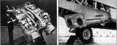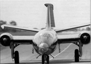 Крыло самолета в центральной его части (до мотогондол) прямое, консоли – трапециевидные. Профиль крыла – симметричный, его относительная толщина меняется от 12% (у корня) до 9% (у законцовок). Угол установки крыла – 2". Угол поперечного V в центральной части равен 2°, на консолях – 4,3°. Продольный силовой набор крыла состоит из основного и вспомогательного лонжеронов, имеющих двутавровое поперечное сечение, и стрингеров. Основной лонжерон расположен на 40% хорды. Он выполнен цельным и проходит сквозь фюзеляж. К вспомогательному лонжерону крепятся щитки и элероны. Элероны выполнены с осевой аэродинамической компенсацией и весовой балансировкой. Правый оснащен пружинным сервокомпенсатором, левый – триммером с электроприводом. Механизация крыла включает 4 секции двухпозиционных («выпуще- но»-«убрано») посадочных щитков, отклоняемых на угол 30°. Кроме того, крыло оборудовано воздушными тормозами оригинальной конструкции, представляющей собой профили швеллерного сечения в виде пальцев, которые выдвигаются в поток на 305 мм относительно верхней и нижней поверхностей крыла. На консоли крыла имеется 21 такой палец, из которых 9 выдвигаются вверх и 12 – вниз. Каждая пара пальцев (верхний и нижний) крепится к одной качалке, насаженной на вал по типу ригельного замка. Воздушные тормоза двухпо- зиционные.