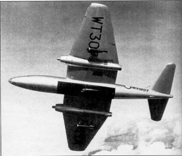 Проектирование реактивной машины осложняло не только отсутствие у ее создателей должного опыта, но и то, что в распоряжении инженеров не было высокоскоростной аэродинамической трубы (этот недостаток исправили только в 1949 г.). Поэтому большую часть первоначальных расчетов, а также отработку разных вариантов компоновки проверить было просто негде. Отчасти этим можно объяснить выбор крыла. Конечно, Питтер был в курсе преимуществ стреловидности несущих поверхностей, но он был осведомлен и об их недостатках, что требовало проведения дополнительных исследований. Поэтому стреловидное крыло отложили на завтра, а в проекте решили использовать прямое крыло умеренного удлинения (4,3) с симметричным профилем приличной относительной толщины (12% у корня и 9% у законцовки).
