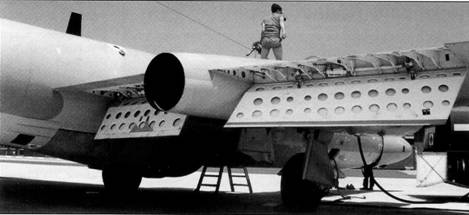 Топливо размещается в трех фюзеляжных топливных баках, емкость которых: бак № 1 – 2327 л, № 2 – 1436 л, № 3 – 2461 л. Кроме того, имеется возможность подвески двух баков под законцовки крыла. Емкость каждого подвесного бака – 1125 л. Топливо из подвесных баков поступает в бак № 3 под давлением воздуха, отбираемого от компрессоров двигателей. В каждом фюзеляжном баке установлены два (по правому и левому борту) топливных насоса низкого давления с электроприводом. Последовательность выработки топлива из баков определяется летчиком путем включения тех или иных насосов. Находящиеся с одного борта три насоса объединены топливопроводом, по которому керосин подается в насос высокого давления, а далее – в топливорегулирующую автоматику двигателя. В кабине летчика имеются три расходомера.
