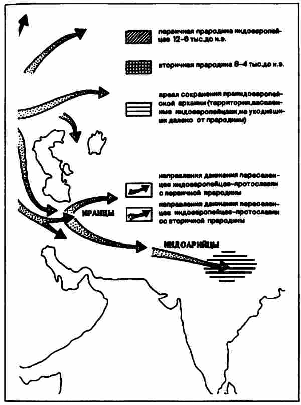 Что ещё можно узнать по интересующей нас проблеме? Существует, например, такая теория: у индоевропейцев было две прародины — первичная и вторичная. На первой они зародились как предэтнос, как начальная форма языковой и человеческой общности. Затем судьба помотала их по белу свету, и, уже осев на новой родине, второй, соединившись с её аборигенами в какой-то степени, они и выработали из себя окончательно то, что мы имеем в виду под понятием «индоевропейцы». Интересная теория, исключать её из рассмотрения нельзя. Тем более что и логика нам подсказывает — действительно, мест, на которых оседала в разные периоды та или иная культурная общность, могло быть и два, и более, пример тому — Великое переселение народов полуторатысячелетней давности, да и многие другие события мировой истории. И это вполне обосновано — этнос, утративший свою экологическую и историческую «нишу», поднимается с насиженных мест и перебирается на новые. Начинается новый виток его развития, иногда более удачный и мощный.