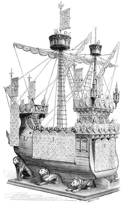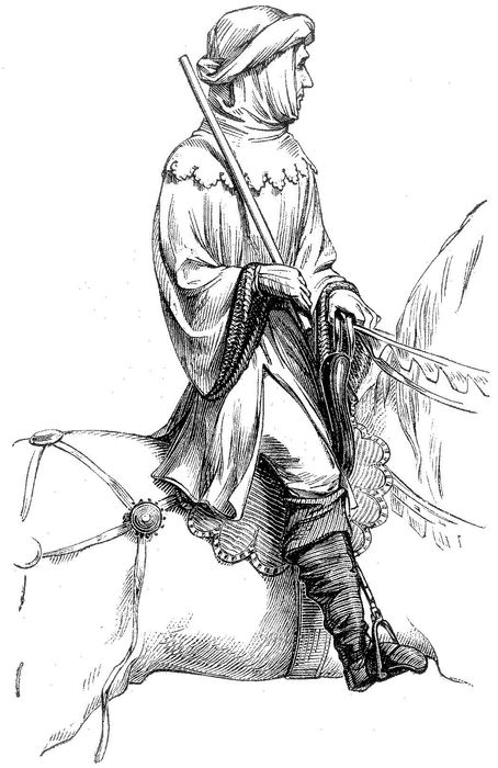 Жуанвиль, однако, в своих воспоминаниях [54] приводит любопытный случай. Он рассказывает, что, возвращаясь с товарищами на корабле в Дамиетту после разгрома, они были атакованы и «...конные сарацины, что находились на берегу, стали метать в нас дротики, дабы мы не могли выйти. Мои люди одели меня в турнирную кольчугу, дабы сыпавшиеся на наше судно дротики меня не ранили». Жуанвиль тогда был болен и так слаб, что не мог держаться на ногах. Он не в состоянии был надеть гамбизон и боевую кольчугу. Следовательно, можно сделать вывод, что турнирная кольчуга была легче, чем обычная боевая (прим. авт.).
