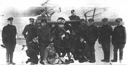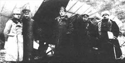 Летчики 26-го корпусного авиаотряда. И. И. Петрожицкий стоит четвертый справа, за ним – поручик К. А. Калинин, ставший впоследствии знаменитым авиаконструктором. Зима 1917 г.
