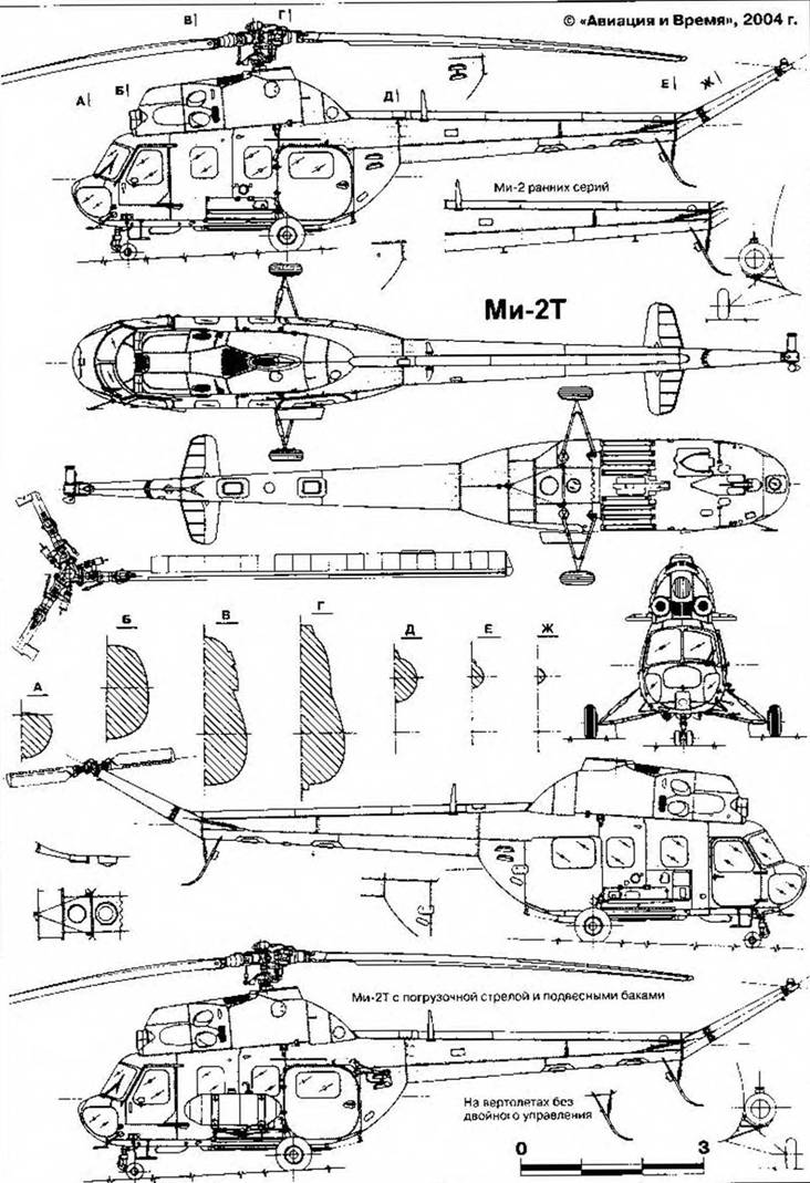 Базовым вариантом "двойки" был Ми-2Т (Mi-2T. Т – transportowy). Вертолет мог перевозить до 700 кг груза внутри фюзеляжа (800 кг – на внешней подвеске) и оснащался электрической лебедкой ЛПГ-2 грузоподъемностью 120 кг с погрузочной стрелой, расположенной над дверью. Ми-2Т легко переоборудовался в санитарный для перевозки на носилках 4 лежачих больных, а также одного сопровождающего медработника Позже строились и специализированные варианты: Санитарный Ми-2С (Mi-2S. S – sanitarily) и санитарно-реанимационный Ми-2СР (MI-2SR. SR – sanitarno-reanimacyjny), отличавшиеся составом профильного оборудования. Сельхозвариант Ми-2СХ(2*) оснащался двумя 600-литровыми наружными баками, которые устанавливались по бортам фюзеляжа, и тремя сменными комплектами спецоборудования: а) двумя или тремя штангами опрыскивания для применения жидких химикатов (две 25-метровых по бортам и одна 14-метровая – под хвостовой балкой); б) двумя распылителями для мелкодисперсных Сухих химикатов; в) Двумя роторными разбрасывателями для гранулированных удобрений. По вертолетному оборудованию Ми-2СХ не был унифицирован с другими модификациями, в частности имел отличил в электросистеме. Следующей модификацией стал пассажирский Ми-2П (Mi-2P. Рpasazerski). предназначенный для перевозки 8 пассажиров- один располагался рядом с пилотом, семь – в грузовой кабине на двух трехместных блоках сидений, установленных спинками друг к другу на контейнере топливного бака, и одноместном сиденье напротив двери. Как его под- вариант существовал Ми-2П «Салон» для перевозки особо важных персон.