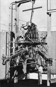 Теоретические изыскания продлились более года. За это время группа разработчиков рассмотрела около 80 вариантов различных систем управления. В итоге 24 июня 1948 г. Салмон представил проект летающего дистанционно управляемого стенда. Он представлял собой трубчатую раму с двигателем J33, к удлинительной трубе которого присоединялось с помощью шарнирного соединения отклоняемое сопло. Часть горячих газов отводилась по жаропрочным трубопроводам к двум небольшим поворотным рулевым соплам, дифференциальное отклонение которых позволяло поворачивать аппарат вокруг продольной оси. Стенд построили на заводе в Сан-Диего. Для обеспечения безопасности обслуживающего персонала его подвесили на тросе, а испытательную площадку огородили стальными листами. Управление осуществлялось по кабелю. Первые включения двигателя провели 20 октября 1950 г., а первый «полет» с работающей системой управления состоялся 31 мая 1951 г. Наконец мечта инженеров «Райен» стала обретать реальные формы. Но с момента подписания контракта прошло более 4-х лет, выделенные деньги закончились, да и самолет «38» морально устарел. Следовало разработать новый истребитель и заново начинать переговоры с военными.