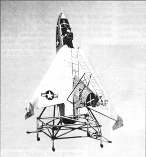 В следующей фазе испытаний предстояло проверить Х-13 во время вертикального взлета и посадки. Полной уверенности в его предсказуемом поведении на этих режимах у Бейтса и Жи- рарда не было, самолет запросто могло бросить в сторону или раскрутить реактивным моментом от вращающихся компрессора и турбины двигателя. В такой ситуации «Вертиджету» желательно находиться как можно дальше от платформы, а лучше всего ее вообще убрать. Поэтому решили временно установить самолет в вертикальное положение с помощью закрепленной на нем трубчатой четырехколесной рамы. Для компенсации веса рамы с «Вертиджета» сняли элевоны, руль направления, фонарь и часть крыльевых шайб, что позволило сохранить тяговооруженность на прежнем уровне. Для посадки летчика в кабину к раме прикрепили лестницу