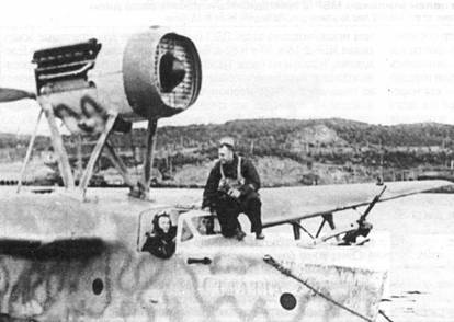 Передняя и задняя стрелковые установки серийного МБР-2-М-34. У пулеметов: штурман мл. л-т Г.Г.Павлов (слева), стрелок-радист Е.Л.Коноплин. СФ, 1942 г.