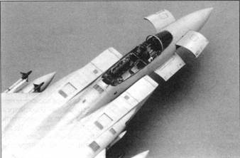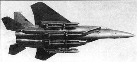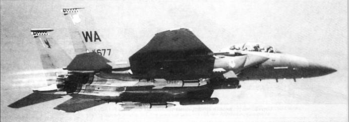 На конформных баках следует остановиться подробнее. Требования увеличения дальности полета всегда стояли на одном из первых мест при модернизации боевых авиационных комплексов. Поэтому уже в первой половине 1970-х гг. «Макдоннелл Дуглас» приступила к разработке для F-15 быстросъемных подвесных конформных контейнеров FAST PACK (Fuel and Sensor Tactical PACK). Два контейнера (в сумме – на 4265 кг топлива), имевшие длину 9,90 м, максимальную высоту 0,92 м и ширину 0,61 м, крепились к бортам фюзеляжа под крылом. По расчетам, их применение увеличивало боевой радиус действия истребителя на 71% – до 2100 км. При этом расчетная перегоночная дальность достигала 6300 км. Контейнеры FAST PACK имели полумонококовую конструкцию из алюминиевых сплавов. По замыслу создателей этих необычных агрегатов, они должны были значительно расширить круг боевых задач, решаемых F-15. В частности, на держателях, расположенных вдоль контейнеров, могли подвешивать шесть авиабомб типа Мк.82 (калибром 450 кг). Кроме того, прорабатывалась возможность размещения в переднем отсеке одного из контейнеров различного разведывательного или навигационного оборудования, а также систем радиоэлектронного противодействия (РЭП). В них мог находиться и водо-спиртовой раствор для охлаждения воздуха на входе в компрессор двигателя, использование которого обеспечивалократковременное увеличение тяги ТРДДФ, а также вспомогательные ЖРД AR2-3A (2x2700 кгс). Как утверждалось, включение этих двигателей позволяло F-15 выполнить сверхзвуковой «бросок» на высоте до 23 км.