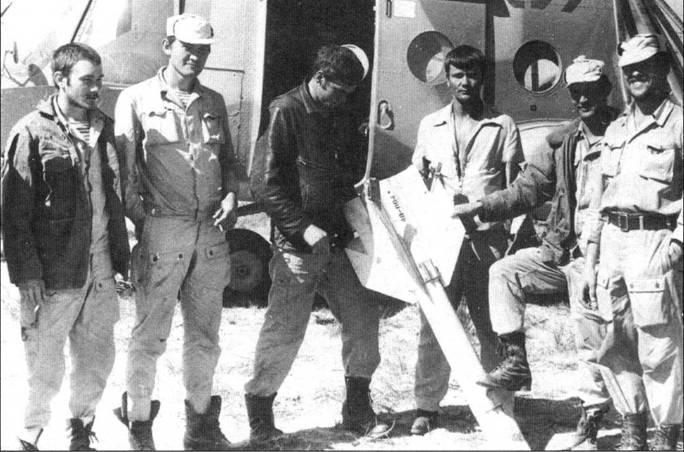 Десантники и вертолетчики возле обломка «Сайдвиндера». Иран, 5 апреля 1982 г.