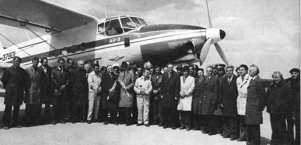 К Новому году самолет вернулся в Киев. Так как в то время опытное производство антоновской фирмы было загружено постройкой Ан-124, то превращение Ан-2 в Ан-3 осуществлялось на летно-испытательной базе в Гостомеле. В ходе этой работы в фюзеляже самолета между шпангоутами 5 и 6 сделали 370-мм вставку и организовали в этом месте по левому борту входную дверь с окном. В грузовой кабине установили химбак емкостью 1500 л* Машину оснастили поступившим из Омска опытным двигателем, внесли необходимые изменения в топливную систему. В кабине экипажа оборудовали одно место летчика. К сожалению, не удалось внедрить часть новшеств интерьера кабины, отработанных на макете. В начале февраля переделка завершилась, и Ан-3 выкатили из цеха. Он получил заводской №379-01 (регистрационное обозначение СССР-37901).