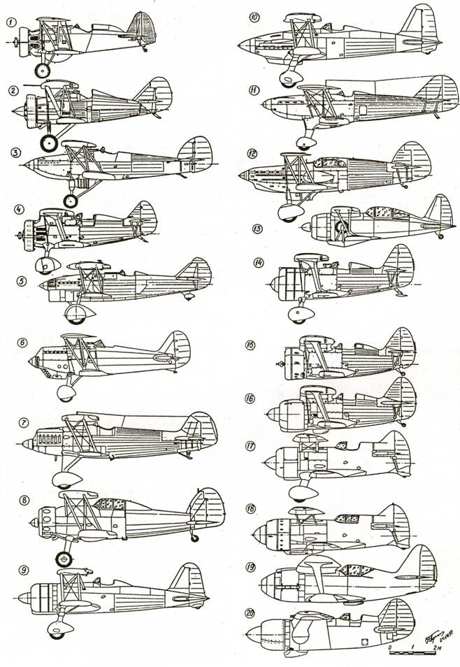 1. Боинг Р-12Е (США, 1929); 2. Григорович, Поликарпов И-5 (СССР, 1930); 3. Хаукер «Фьюри» 1(Англия, 1929); 4. Поликарпов И-15 (ЦКБ-3, 1933); 5. Фиат CR-32 (Италия, 1934); 6. Накадзима Ки-10-1 (Япония, 1935); 7. Хейнкель Не-51 (Германия, 1933); 8. Глостер «Гладиатор» (Англия, 1934); 9. Фиат CR-42 (1938); 10. Фиат CR- 42В (1940); 11. Фэйри «Фантом» (Бельгия, 1935); 12. Авиа В.534 (Чехословакия, 1933-36); 13. FDB-1 (Канада, 1937); 14. Поликарпов И-15бис( 1937); 15. И-153 (1938); 16. Поликарпов И-190 (1939); 17. Боровков, Флоров 7211 (СССР, 1937); 18. Боровков, Флоров И-207 изд. 9 № 5 (1941); 19. Поликарпов И-195 (проект, 1940); 20. Никитин, Шевченко ИС-2 (1941).