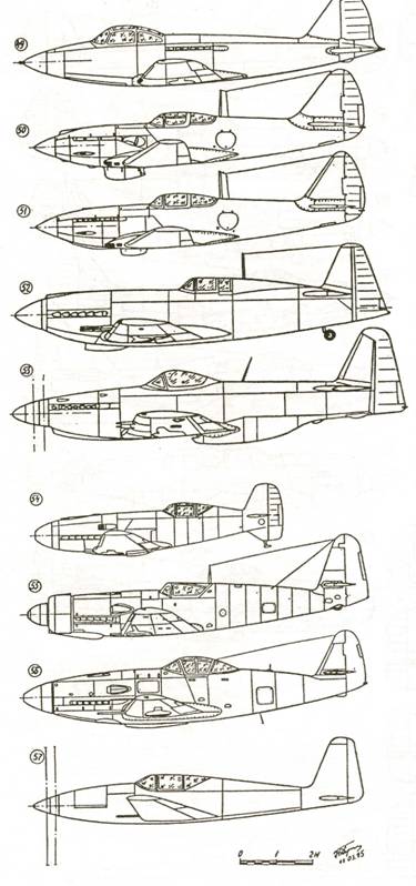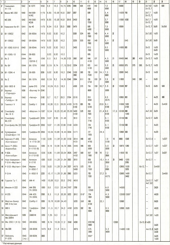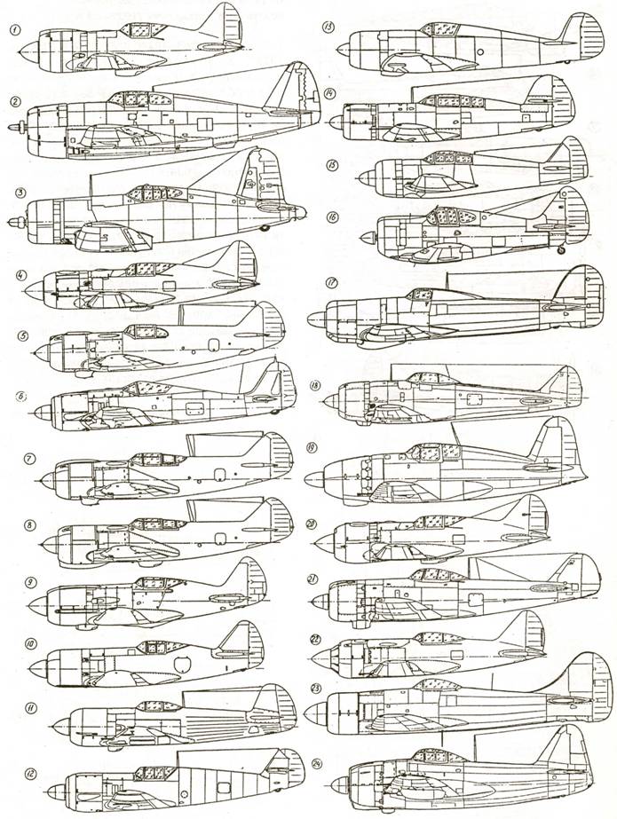 1. И-185М-71 (Поликарпов, 1941); 2. РипабликХР-47В (США, 1941); 3. Чане BoyrF4U-1 «Корсар» (США, 1941); 4. И- 185М-82А (1941); 5. Лавочкин Ла-5(1942); 6. Фокке- Вульф FW- 190А-5( 1943); 7. Ла-5ФН (1943); 8. Ла-5М- 71Ф (1943); 9. Микоян, Гуревич МиГ-9М-82 (1942); 10. Микоян, Гуревич И-211(E) (1943); 11. Яковлев Як-7М- 82(1942); 12. Мессершмитт Bf- 109F(BMW-801X 1941); 13. WM-23 (Венгрия, 1941); 14. VL «Мирски» II(Финляндия, 1942-44); 15. SAAB J-22 (Швеция, 1942); 16. Са-13 «Бумеранг» (Австралия, 1942); 17. Хаукер «Торнадо» (Англия, 1940); 18. Накадзима Ки-44 «Шоки» (Япония, 1942); 19. Мицубиси J2M «Рэйдэн» (Япония, 1942); 20. И- 185М-71 (эталон, 1942); 21. Накадзима Ки-84 «Хаяте» (1943); 22. И- 187М-71/И- 188М-90(проекты модификаций И-185, 1943); 23. Хаукер «Темпест» II (1943); 24. Каваниши N1K1J «Шидэ» (Япония, 1943); 25. Мицубиси А6М5 «Зеро» (1943); 26. FW- 190А-8 (1944, вариант с улучшенным фонарем); 27. Ла-7 (1944); 28. Рипаблик P-47D-27 «Тандерболт» (1944); 29. Грумман F6F3 «Хеллкэт» (США, 1943); 30. Грумман F8F1 «Биркэт» (1944); 31. Кавасаки Ки-100-1 (Япония, 1945); 32. F4U4 «Корсар» (1944); 33. Рипаблик XP-47J – самый скоростной поршневой истребитель (1943-44); 34. Мицубиси A7M3-J (1945); 35. Накадзима Ки-87 (1945); 36. Як-ЗУ; 37. Ла-9 (1946); 38. Ла-11 (1947); 39. Пиаджио Р-119 (Италия, 1942. Двигатель воздушного охлаждения за кабиной летчика); 40. Нортроп ХР- 56 (США, 1945. Схема – «Летающее крыло»); 41. Кюсю J7W1 (Япония, 1945, схема – «Утка»)