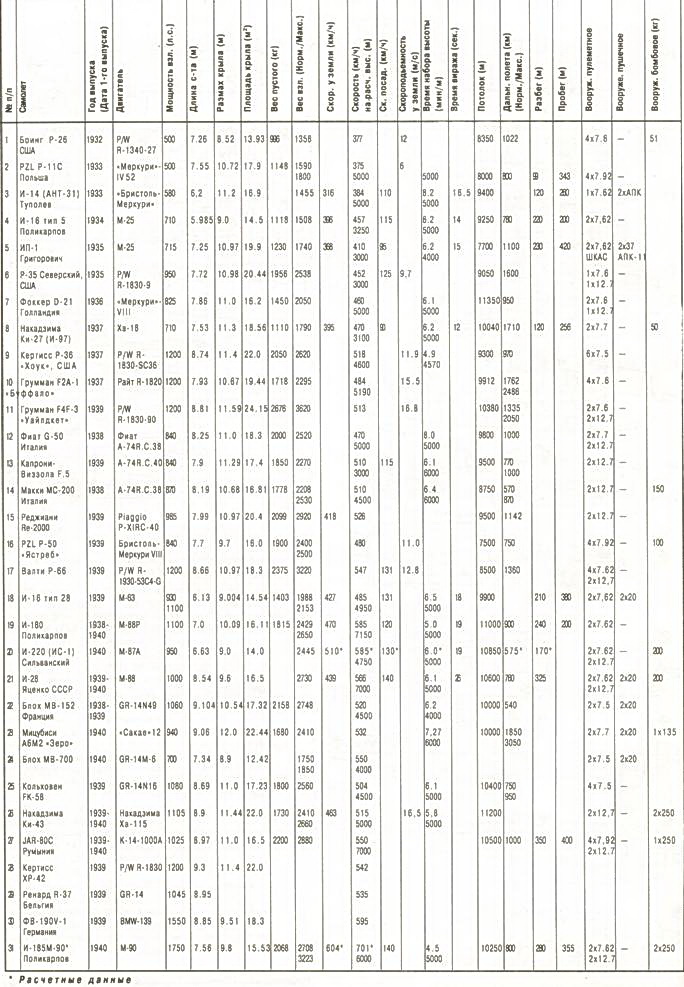 1. Боинг Р-26 (США, 1932); 2. PZL Р-11С (Польша, 1933); 3. И-14 (АНТ-31, Туполев, 1933); 4. Поликарпов И-16 тип 5 (1934); 5. Григорович ИП-1 (СССР, 1935); 6. Северский Р-35 (США, 1935); 7. Фоккер D-21 (Голландия, 1936); 8. Накадзима Ки-27 (И-97, Япония, 1937); 9. Кертисс Р-36 «Хоук» (США, 1937); 10. Грумман F2F-1 «Буффало» (США, 1937); 11. Гоумман F4F-3 «Уайлдкэт» (1939); 12. Фиат G-50 (Италия, 1938); 13. Кётрони-Виззола F.5 (Италия, 1939); 14. Макки МС-200 «Фолгор »(Италия, 1938); 15. Реджиани'Яе-2000 (Италия, 1939); 16. PZL Р-50 «Ястреб» (1939); 17. Валти Р-66 (США, 1939); 18. И-16 тип 28 (1939); 19. И-180 (Поликарпов, 1938- 40); 20. Сильванский И-220 (СССР, 1940); 21. Яценко И-28 (СССР, 1939-40); 22. Блох MB-152 (Франция 1938-39); 23. Мицубиси А6М2 «Зеро» (Япония, 1940); 24. Блох МВ-700 (1940); 25. Кольховен FK-58 (Голландия, 1939); 26. Накадзима Ки-43 «Хаябуса» (Япония 1939-40); 27. JAR-80C (Румыния, 1939-40); 28. Кертисс ХР-42 (1939); 29. Ренард R-37 (Бельгия, 1939); 30. Фокке-Вульф FW-190V-1 (Германия, 1939); 31. Поликарпов И-185М-90 (СССР, 1940).