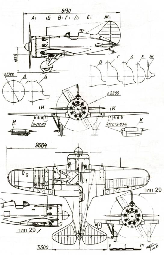 Следует отметить, что минимальные размеры, обеспечивая лучшую маневренность и меньший вес, одновременно делали истребитель и менее перспективным, ограничивая возможности применения новых, более мощных, но и более тяжелых двигателей. Это хорошо видно на примере И-16, на котором даже установка первых, сравнительно легких (650- 700 кг), двухрядных моторов воздушного охлаждения была довольно затруднительной, требовала некоторого изменения геометрических параметров. Так в 1938 г. появился И-180. А под двухрядную «звезду» мощностью 1600-2000 л.с. (вес таких двигателей 850-1100 кг) необходим был уже совершенно новый самолет, и в 1940 г. Поликарпов проектирует И-185.