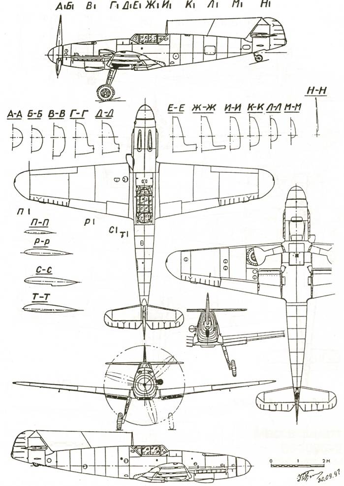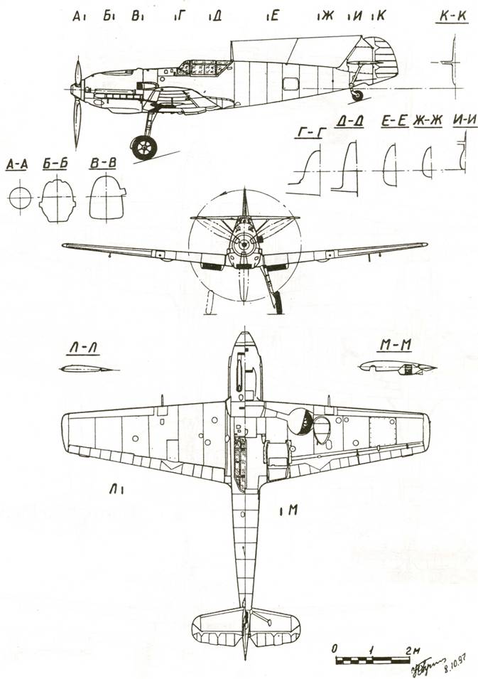 Первые истребители-монопланы выпуска 1933-35 г.г. – И-14, И-16, И-17, Мессершмитт Bf-109В – оснащались двигателями мощностью 680-800 л.с., имели удельную нагрузку на крыло 100-120 кг/м 2 и развивали скорость 440-480 км/ч. Размеры самолетов были небольшие, а у И-14 и И-16 – предельно малые. Среди них резко выделялся габаритами – достаточно большими даже для 1945 г. – «Харрикейн» Мк. 1. По весу он тоже был почти на тонну тяжелее, но и двигатель имел значительно более мощный (1030 л.с.), что позволило получить скорость 507 км/ч. Выглядела машина довольно громоздкой, и не случайно через год аэродинамически более совершенный «Спитфайр» Мк 1, с таким же мотором и одинаковым вооружением (8x7,7 пулеметов) при скорости 560 км/ч весил почти на 200 кг меньше. Примерно такую же скорость имел и Мессершмитт Bf-109D в 1938 г., получив мотор DB-601A (1150 л.с.).