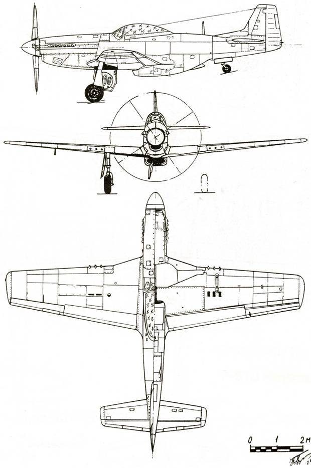 Лучшим американским истребителем принято считать Р-51 «Мустанг» серий В, С, D. Первоначальный вариант Р- 51 А, созданный фирмой НортАмерикен по заказу ВВС Англии, с невысотным двигателем «Аллисон» V-1710 (1200 л.с.) имел хорошие летные данные только на малых высотах, в силу чего часто использовался как истребитель-бомбардировщик. Но в 1942 г., по инициативе англичан, на «Мустанг» установили мотор «Мерлин». С ним характеристики самолета резко улучшились (скорость – порядка 700 км/ч), и дальнейшие модификации – В, С, D, N – выпускались только с мотором «Паккард» V-1650-3, представлявшем собой лицензионный вариант «Мерлина». Теперь «Мустанг» мог вести активный воздушный бой с любым противником в широком диапазоне высот, а при полной заправке использовался, как и «Тандерболт», в качестве истребителя сопровождения – яркий пример того, как хороший двигатель может посредственный истребитель превратить в выдающийся.