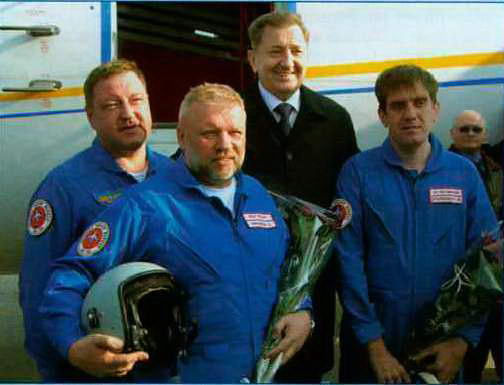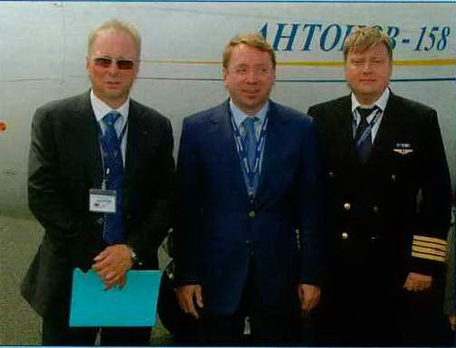 После успешного завершения первого полета Ан-158. Слева направо: второй пилот А.В. Спасибо, командир экипажа C.M. Трошин, Генеральный конструктор Д.С. Кива и ведущий инженер Н.В. Сидоренко. На фото справа – Генеральный директор ИФК А.И. Рубцов, Управляющий делами Президента России В.И. Кожин и начальник летно-испытательной службы ГП «Антонов» Е.А. Галуненко