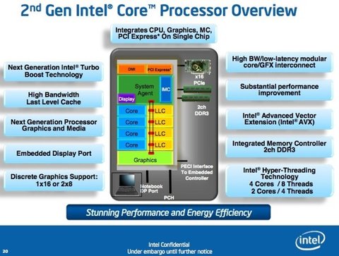 Корпорация Intel официально представила второе поколение процессоров Core, известное под кодовым названием Sandy Bridge, а также несколько наборов системной логики для этих чипов. Принципиальное отличие этих процессоров от предшествующих моделей заключается в том, что в них и ЦП, и графическое ядро, и контроллер оперативной памяти выполнены на одном кристалле. Для сравнения, в Core первого поколения (Clarkdale и Arrandale) это отдельные модули, установленные на одной плате и просто закрытые общей крышкой. Интеграция позволяет оптимизировать схему, а учитывая переход с 45-нм на 32-нм технологический процесс, ещё и снизить себестоимость производства.