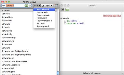 Вопрос с ходу и по лбу: зачем нужен официальный словарь Lingvo, когда давно уже существуют народные порты под встроенную в ОС утилиту? Даю такой же в лоб ответ: потому что мне не нужен английский словарь практически совсем и уже очень давно. Так вот просто. То есть: когда ваши потребности ограничены Руглишем, наверное нет смысла отслюнявливать 1300 рублей ABBYY за словарь (на самом деле - есть, но об этом чуть позже). Если же вам, как и мне, нужны другие языки (я, например, пользуюсь всеми из пакета Lingvo for Mac OS X - и немецким, и португальским, и французским, и итальянским, и испанским), то без вариантов: августовская премьера ABBYY - бальзам на иссохшую филологическую душу.