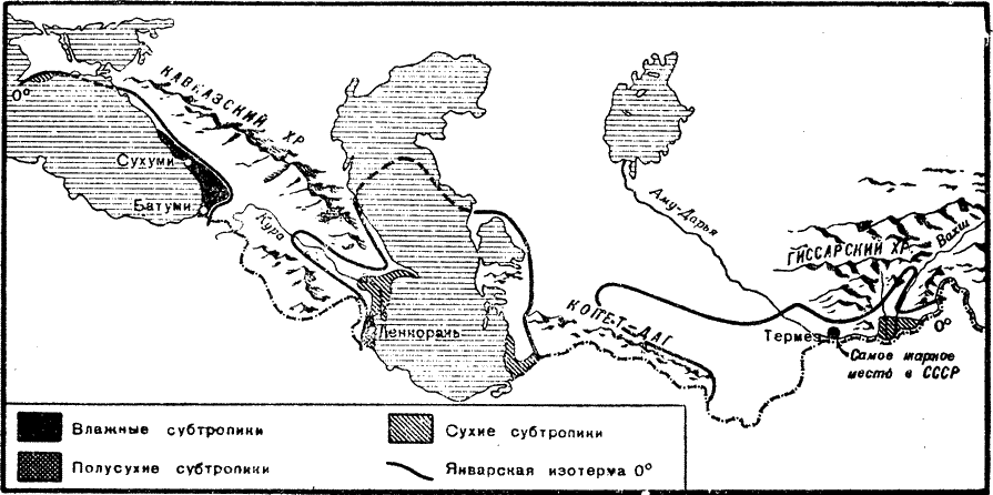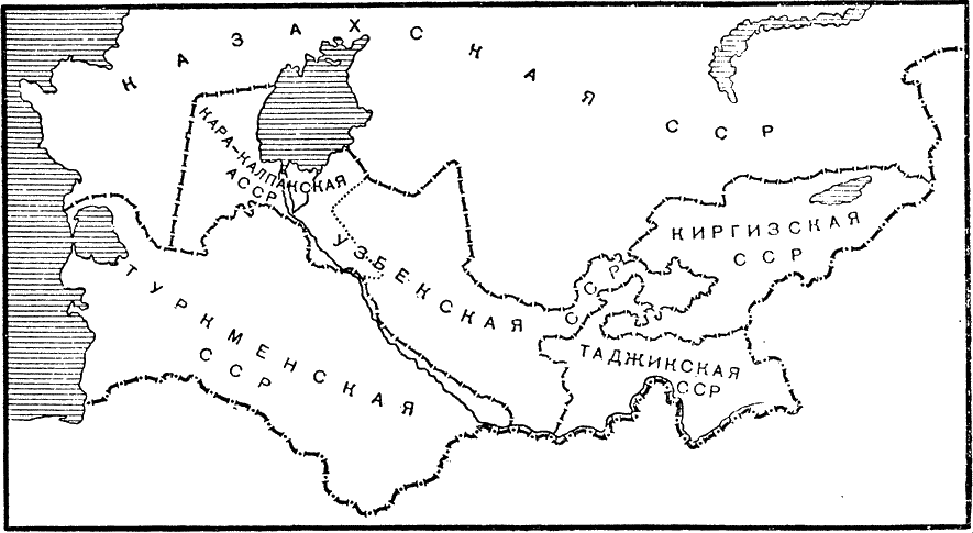 Еще южнее лежат республики Советской Средней Азии — Узбекская, Туркменская, Таджикская, Киргизская.