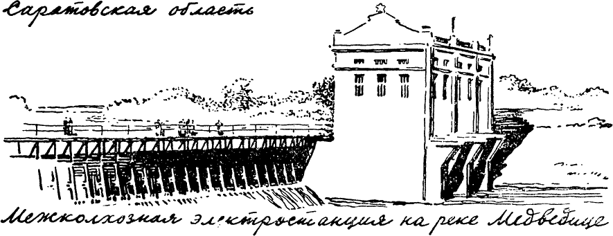 С борта парохода, плывущего по Волге, видны сквозные вышки нефтепромыслов. Нарушая привычное представление о волжском пейзаже, вышки возникают здесь и там — на равнине Татарии, в ущельях Жигулей. А в стороне от реки, на полях Заволжья, раньше совсем беззащитных перед засухой, тоже новшества, принесенные сюда колхозным строем: засухоустойчивые культуры, ленты лесных полос, искусственные водоемы на перекрытых плотинами балках.