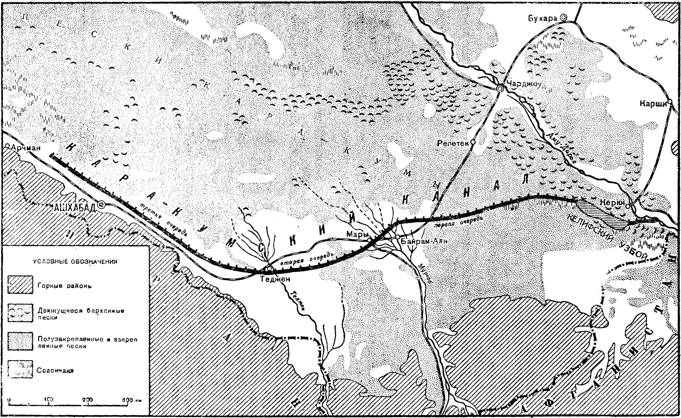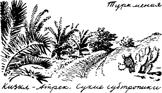 Сухие степи перешли в пустыни — больше солнца, меньше влаги. Жара, песок, редкая жесткая трава. Эта земля была бы совсем пустынна, если бы на юге, за Фрунзе, Ташкентом, Сталинабадом и Ашхабадом, ее не обрывали цепи гор. Заоблачные хребты Тянь-Шаня и Памира задерживают на своих склонах издалека доносящееся влажное дыхание морей; оно сгущается в лед глетчеров и снега вершин, рождает реки и оживляет ими часть равнины.