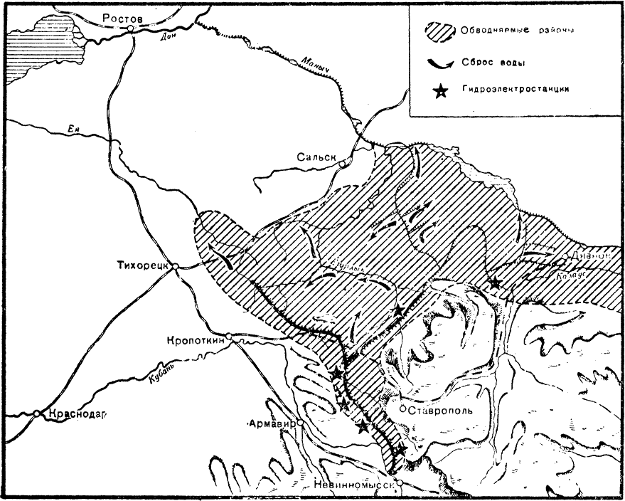 Мирные бескрайные поля, цветущие сады и виноградники, белые хаты колхозных станиц… Снова видим мы волю народа к преобразованию страны. Дон прегражден плотиной, разлилось «Цимлянское море», из него пошла вода на орошение полей. Гора у Невинномысска пробуравлена тоннелем, и часть Кубани уведена к полям Ставропольского плато. На месте полувысохшего Маныча проложен водный путь. Разрослись индустриальные города Ростов, Ставрополь, Краснодар. В предгорьях Кавказа поднялись нефтяные вышки.