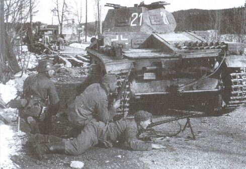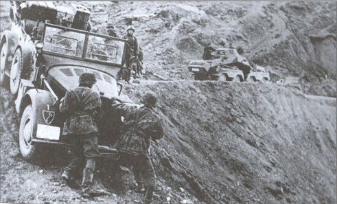Преодолевая упорное сопротивление противника, хорошо знавшего местность, немецкие войска с трудом продвигались вперед по горным дорогам в условиях еще не окончившейся зимы. Наступление развивалось, как правило, вдоль важнейших дорог, на которых, кстати сказать, почти все мосты были разрушены и которые изобиловали различными заграждениями. Впереди групп наступали, как правило, пехотные взводы, реже — роты. Наступающие были вынуждены идти по узким горным ущельям и долинам. Именно здесь и поджидал их противник! Он укреплялся в долинах и на склонах гор и нередко благодаря этому достигал определенного, хотя и местного успеха. Противник был оснащен прекрасным зимним снаряжением и часто использовал лыжи, в то время как немецкому пехотинцу приходилось идти, утопая по колено в снегу. Многие боевые группы сплошь и рядом состояли из подразделений различных частей и соединений, снаряжение и вооружение которых приходилось на скорую руку пополнять за счет трофеев. Весьма ограниченное количество повозок и лошадей требовало использования любых подручных транспортных средств. Недостаток полевых кухонь и плохие условия размещения солдат на ночевках усугубляли трудности боевых действий в условиях малодоступной горной местности. Все это вынуждало немцев приспосабливаться к обстановке, изыскивать наиболее соответствующие ей формы и методы борьбы. Так, например, здесь впервые появилась необходимость вести наступление мелкими боевыми группами, которые создавались применительно к условиям боя и действовали, как правило, не имея локтевой связи друг с другом. По своему составу группы никоим образом не напоминали обычные части и подразделения военного времени. Здесь было перемешано все. Саперы, артиллерийские взводы, танковые взводы, подразделения тяжелых и легких минометов — все одинаково прокладывали путь атакующим пехотинцам.