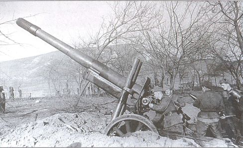 Расчет 152-мм гаубицы-пушки МЛ-20 образца 1937 года ведет огонь по немецким войскам. Орудие имеет камуфляж: коричневые пятна, нанесенные на зеленый базовый фон. Северо-Кавказский фронт, февраль 1943 года (АВЛ)