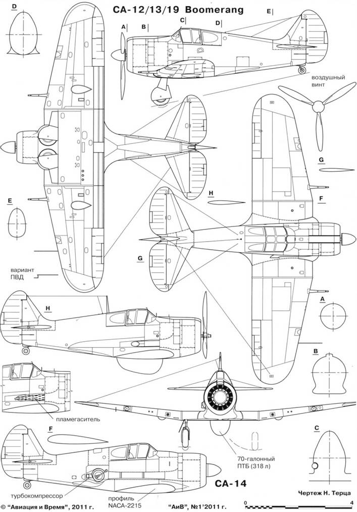 Необходимость использовать «Бумеранг» в качестве истребителя-перехватчика требовала улучшить высотные характеристики мотора. Поэтому было решено оснастить машину турбокомпрессором фирмы «Дженерал Электрик», который разместили в хвостовой части самолета (его ковшеобразный воздухозаборник располагался по левому борту фюзеляжа). Также доработали капот двигателя и центроплан. Новая модель получила обозначение СА-14. Ее испытания показали, что высотные характеристики двигателя улучшились, однако требуются доработки. Во время их проведения воздухозаборник турбокомпрессора перенесли под капот (трубопровод от него проходил под обшивкой по левому борту фюзеляжа), перед двигателем установили 18-лопастный вентилятор, винт фирмы «Кертисс» заменили на тип «де Хэвилленд». Кроме того, увеличили площадь хвостового оперения, при этом киль приобрел характерную трапециевидную форму.