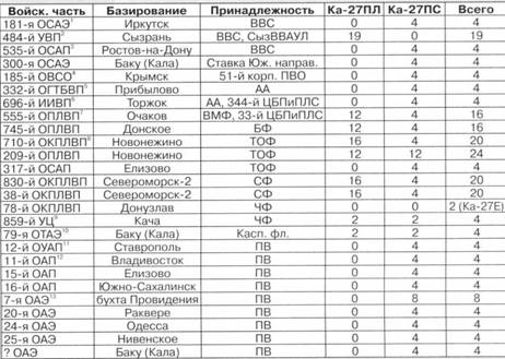 Поставки серийных вертолетов в строевые части авиации ВМФ СССР начались в 1979 г., когда первые машины прибыли на Черноморский флот (ЧФ). В том же году Ка-27 стали осваивать авиаторы Северного флота (СФ). В октябре 1982 г. Ка-27 поступили в тихоокеанский 710-й полк, а в 1986 г. на Ка-27 переучилась одна эскадрилья 745-го полка Балтфлота (БФ). Как видно из представленной на стр. 11 таблицы, новая камовская машина поступила не только в морскую авиацию, но и в ПВО, ВВС, Армейскую авиацию (АА) и Погранвойска (ПВ).