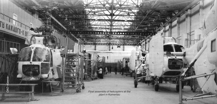 Подготовка на заводском аэродроме в Кумертау к испытательному полету Ка-28, построенного по заказу ВМС Индии. На заднем плане – пожарный вертолет Ка-32А