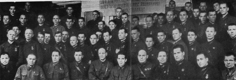 Пограничники 1-й погранбригады, награжденные за участие в боях по защите Ленинграда. Март 1942 г. Среди награжденных в первом ряду пятый слева — С. И. Гусаров, седьмой — генерал-лейтенант Г. А. Степанов