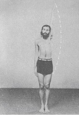 Упражнение «Б»: такое же, как и упражнение «А», только вся операция совершается в обратном направлении. В первом упражнении вы вдыхаете, когда руки выбрасываете вверх. В этом упражнении вы вдыхаете, когда опускаете руки, и выдыхаете, когда подбрасываете их вверх. Упражнение проделать 25 раз (фото 69).