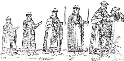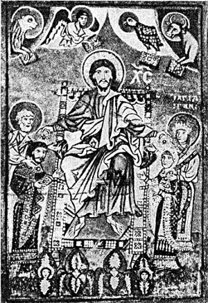 Христос коронует князя волынского и галицкого Ярополка Изяславича († 1088), внука Ярослава Владимировича. Снимок из молитвенника матери Ярополка (налево — Ярополк, направо — его жена).
