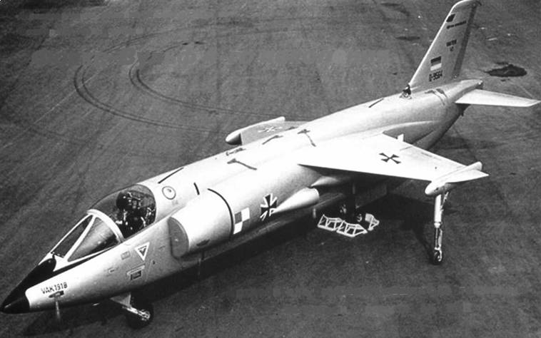 Немецкий EWR 420 от концерна EWR-Sud 2* представлял собой дозвуковой вариант истребителя-бомбардировщика VJ 101D, проект которого стал результатом совместного творчества инженеров EWR-Sud и специалистов американских фирм Boeing и Republic. По своей схеме он походил на уменьшенный британский TSR.2: фюзеляж большого удлинения, малое треугольное крыло и однокилевое хвостовое оперение. На VJ 101D хотели поставить пять подъемных ТРД RB. 162-31 и два подъемно-маршевых RB. 153-61 с дополнительными вертикальными соплами и устройствами перенаправления тяги вниз. Предполагалось построить два опытных VJ 101D. В 1964 г. постройку первого экземпляра начали, но через несколько месяцев прекратили. Концерн стал работать над новым немецко-американским самолетом с крылом изменяемой стреловидности AVS (акроним Advanced V/ STOL – усовершенствованный самолет с вертикальным или укороченным взлетом). Постепенно этот проект трансформировался в европейскую программу MRCA, реализация которой привела к созданию истребителя-бомбардировщика Tornado (см. «АиВ», № 2'2009).