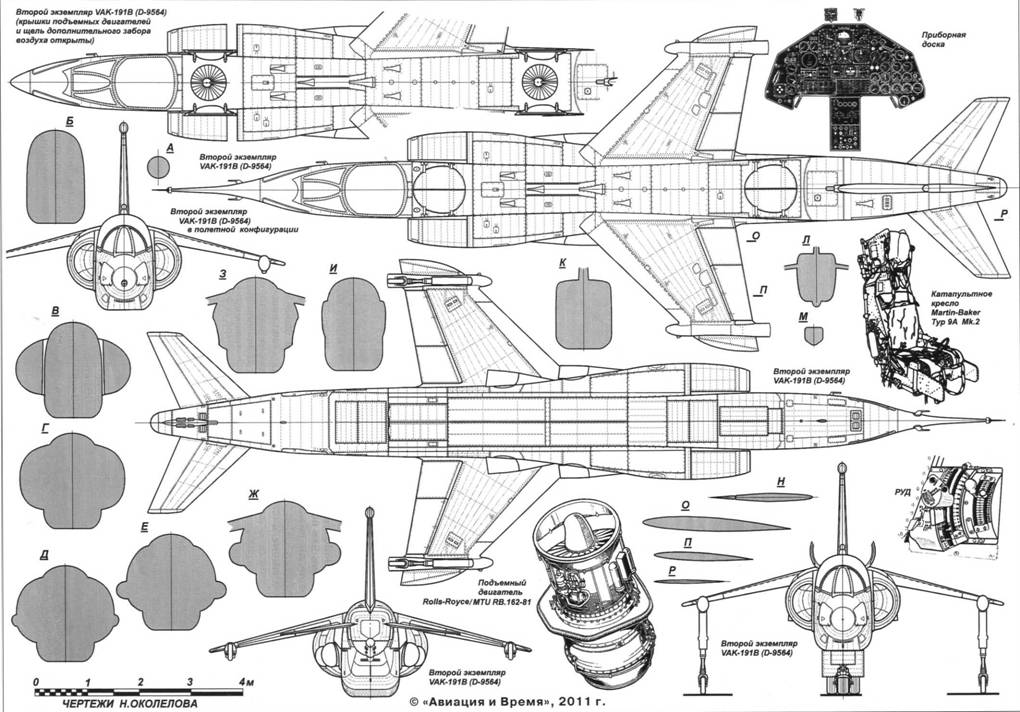 Тем временем конструкторы под руководством доктора Ральфа Риккиуса (Ralph Riccius) напряженно работали над проектом самолета. Исходя из того, что свои боевые задания VAK 191В должен был выполнять на малых высотах, для которых характерна высокая турбулентность, максимум внимания сосредоточили на снижении перегрузок при полете в неспокойном воздухе. С этой целью выбрали крыло с большой удельной нагрузкой, малым удлинением и сравнительно большим углом стреловидности – около 40° по 1/4 хорд. Нагрузка на крыло даже превышала таковую у истребителя F-104G. У «Старфайтера» при нормальной взлетной массе 9000 кг она составляла 494 кг/м² , а у весившего на тонну меньше VAK 191В – 639 кг/м² . Но такие «рекордные» показатели не очень беспокоили конструкторов, ведь у VAK имелись подъемные двигатели и его взлетно-посадочные характеристики априори превосходили таковые F-104G. Недостаток подъемной силы крыла в горизонтальном полете компенсировали небольшим доворотом сопел ПМД: передние решили устанавливать с углом 6° 30', а задние – 5° 12'.