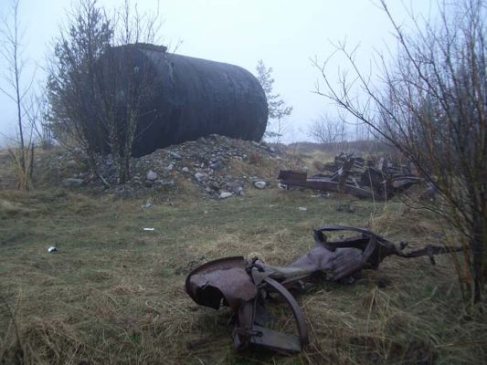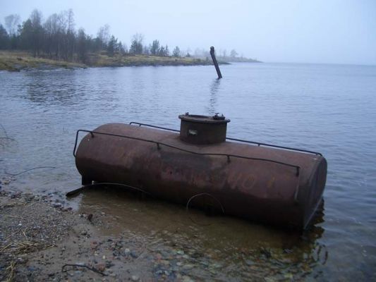 Еще один вполне оптимистичный факт: испытания опасного оружия мало затронули соседний скалистый, укрытый чудесным сосняком остров , составляющий с островами Малый и двумя Безымянными прекрасный фьорд. Здесь необходимо было нам проверить одно «сомнительное» место, о котором ходили разные слухи. Его видно издалека, когда подходишь на лодке. В гранитной скале крутого берега почти на уровне воды чернеет пещера-штольня. Загадочная и мрачная. Подсвечивая дорогу фонарем, проходим в глубь подземелья, не забывая «щупать» радиационную обстановку приборами. Минуем два бетонных «кольца», явно служивших для крепления мощных дверей-затворов. Скоро утыкаемся в тупик, где на полу свален всякий мусор. Радиометры выдают «спокойные» фоновые значения. Следов радиоактивности нет. Судя по устройству штольни, здесь был секретный склад боеприпасов для финских «морских охотников», действовавших на озере против Ладожской флотилии в годы войны.